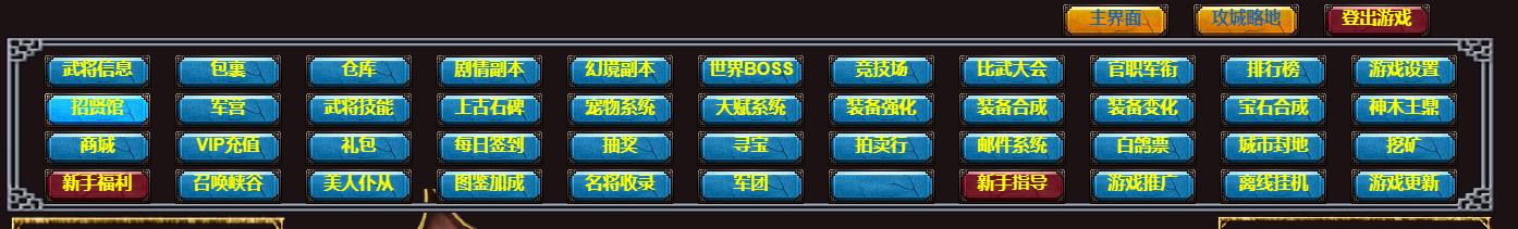 功能介绍: 武将信息,包裹,剧情,副本,BOSS,幻境,竞技场,排行榜,官职军衔,招贤馆,军营,武将技能,石碑,宠物,天赋,装备合成,宝石合成,等等玩法,功能太多,就不一一介绍了,
