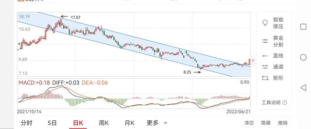 该股从去年高点17.07元开始调整,经过6个月的时间,跌至8.25元,调整幅度超50%。