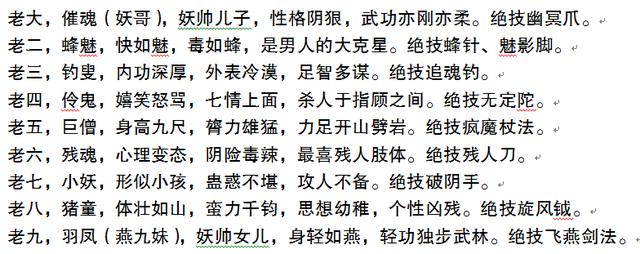 九大护卫:催魂(妖哥)、蜂魅,快如魅、钓叟、伶鬼、巨僧、残魂、小妖、猪童、羽凤(燕九妹)