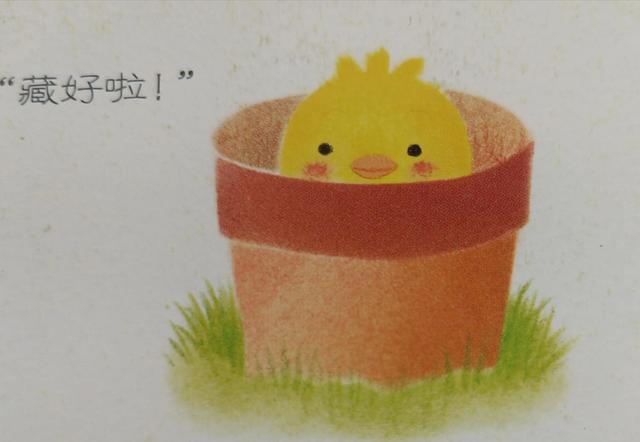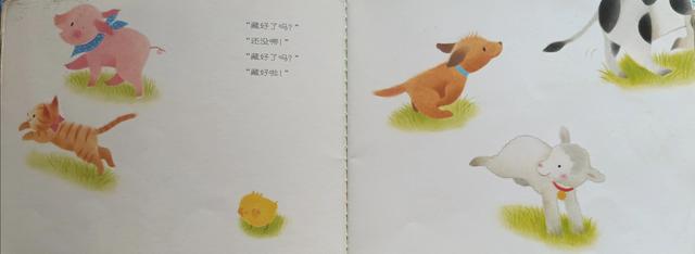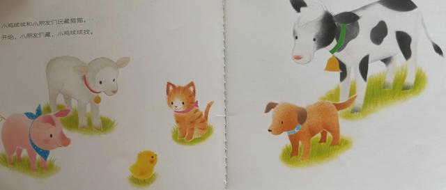 (插图剪裁来源《长江少年儿童出版社小鸡球球成长绘本》特此鸣谢!表演时一人可分饰多个角色,台词可自编,也可中文演绎或半中半英。此剧剧情简单,家长和学长及小朋友可作简述故事的形式,但在场景中实操尽量隐藏与假装暴露结合,动作起来,吸引参与的主演小朋友和配角注意与参与。寻找者一人,藏猫猫的人数随意。被发现的小动物,双语随意,自由灵活回应,练习交流。)