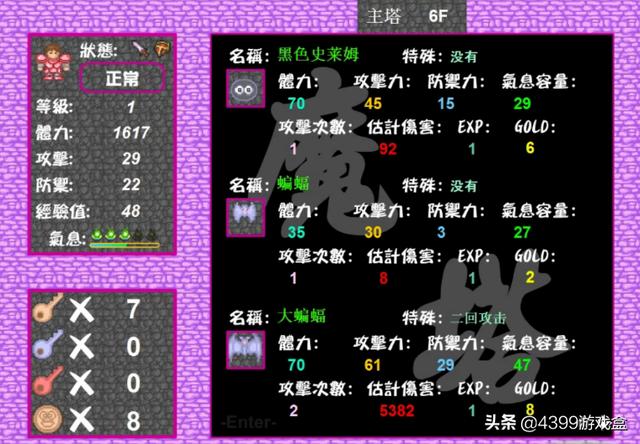 除了剧情上的改动之外,“21/24层魔塔”还增加了经验系统、存档功能,不像“50层魔塔”有一个操作失误就得重来;。