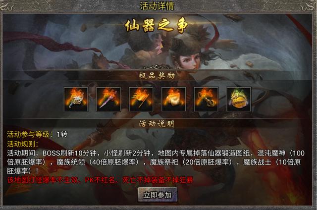 接下来让我们说回仙器之争这个活动,在这个活动里,地图上会刷出小怪和Boss,打这些怪物就会随机掉落图纸或材料,注意,在这个活动里也是可以进行PVP的,如果你是新手玩家,那你一定要小心了,尽量避免与其他玩家正面对抗,一心偷发育就可以了。但是你可能会遇到有玩家看到你就来打你,你还跑不了,这种时候不要伤心,形势比人强,先忍他一手,我们先给他记到小本本里,等到你等级装备起来了再去复仇。