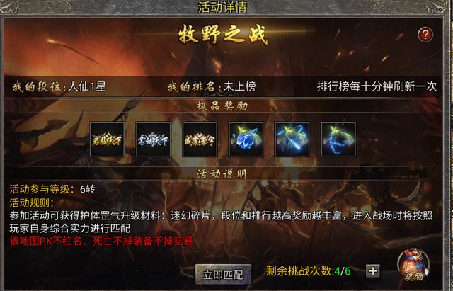 有纯PVP的活动,比如每天的3V3牧野之战,但是你要需要担心这个牧野之战打不赢怎么办,会不会有惩罚,我告诉你完全不会。这个活动就算你输了你都是能够领到奖励的,而且万一你匹配到了大佬赢了,你还会有段位晋级奖励,这个活动每天都可以参加6次,可不要错过了。