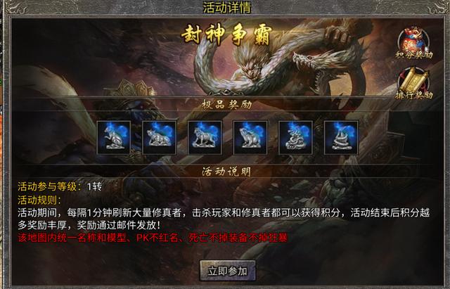 每天有一个活动特别的给力,那就是封神争霸,这个活动如果你是个欧皇的话,那你每天都可以弄到几个生肖的,在这个活动里,你需要杀死怪物和玩家来获得积分,当然不杀玩家也是可以的,杀杀小怪获得的积分也完全是够的,每到达一定的积分,你领取的奖励就会更好,所以你可以完全不找玩家,就专门找怪。当然如果你是大佬的话那完全可以神挡杀神佛挡杀佛。
