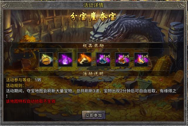 每天还有个要参加的活动,那就是分宝崖夺宝,在这个活动里面,你只需要在一个地方站住,默默等待宝物刷新,2分钟后这个宝物就是你的了。在这里那些大佬们的一键拾取是不管用的,每个人能捡到多少东西全靠自己的运气,但是要注意,这里是能造成伤害的,所以不要为了一件宝物就惹上大佬的仇恨。在这里面你可以捡到各种灵珠,元宝,甚至是好的装备,这可比打怪刷来得快多了。