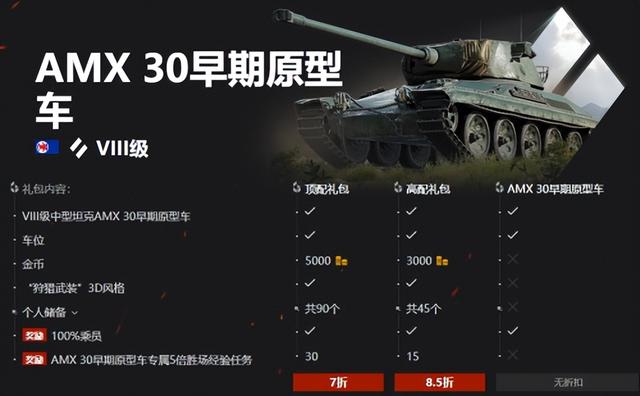 接下来要介绍的AMX 30早期原型车也是一位重磅选手,它拥有VIII级中型坦克里最快的前进速度和排名第二的标准炮弹穿透力,只要它控制了侧翼和后方,敌方并定会如坐针毡。目前这辆VIII级金币中坦正在特惠商城热卖(7月18日10:00下架),此时购买高配和顶配礼包不仅能分别享受8.5和7折优惠,还可获得一款酷炫的狩猎武装3D风格,其灵感来源于热沃丹之兽的传说。