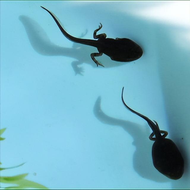 现在的小朋友似乎更难见着小昆虫、小动物了,他们总是充满惊奇。因此,一旦碰到这些小物,我都会很耐心地陪他们看一看,观察一下。观察池塘的小蝌蚪就是一个很好的机会。配合《小蝌蚪找妈妈》的水墨动画,宝宝特别感兴趣。