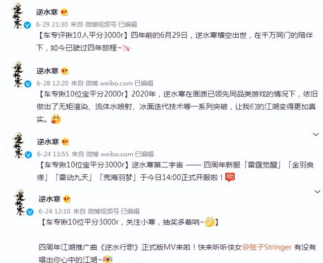 遇到游戏发布新内容,更是几百上千块的现金不断出手,翻看逆水寒官方的微博,几乎可以说是一部薅羊毛的长长历史,每一条微博都带着金钱的味道!