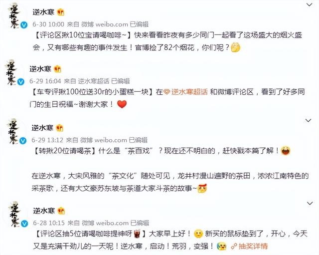 而且逆水寒官博还偏偏喜欢发微博,每天不发个几条都手痒,一天抽十个奖,从几人到上百人都有,基本上关注的50%粉丝都有在微博里中过奖,有些铁粉甚至成了中奖专业户!