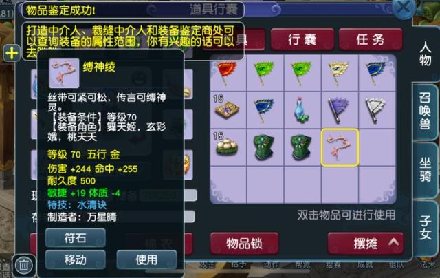 上面是一把70级由玩家打造出来的武器,这把武器拥有着水清诀的特技,而且还增加了19点敏捷,看起来是可以给固伤门派的玩家使用的,但是大家注意一下这件装备的等级,70级的装备比较尴尬的,没有简易特效就不能给69级的玩家使用,现在停留在70级的大多都是五开,而且数量还不多,所以,这把武器的价格不高。