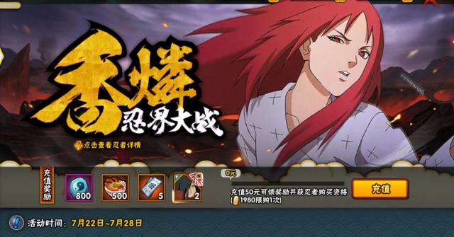 充值满50元金币或点券,即可领取充值奖励,并获得香磷[忍界大战]购买资格+售价1980金币。