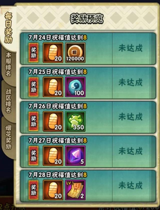 7月22~28日每晚19:00-22:00,点燃爆竹或烟花即可获得祝福值及道具奖励。