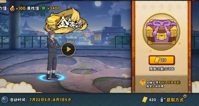 S忍罗砂[四代目风影]入场效果—金色奔流、轮回石*80、忍玉*80、声望*800、铜 币*8000,已经获得的入场效果不会再次获得,累计打开30次必得入场效果!
