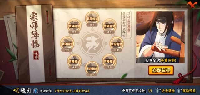 白嫖日向宁次[咏春宗师]hhh~每日登录学习任意咏春招式,还可以获得随机奖励,全部学完必得日向宁次[咏春宗师]!