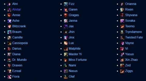 阿狸;皎月;安妮;蛇女;鱼头;发条;光辉;卡牌;亚索;劫;炸弹人