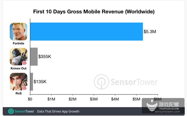 据数据分析公司Sensor Tower的最新数据显示,Epic Games的《堡垒之夜(Fortnite)》手游登录iOS不到两周、开放皮肤内购10天全球营收(App Store+Google Play)预计达到530万美元。