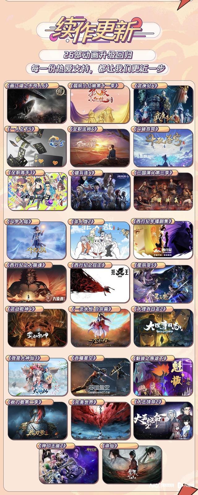 此次发布会公布了一批精品IP的续作开发。不久前正式上线的《斗破苍穹》年播动画与经典作品《斗罗大陆》将继续更新,与观众相约一同见证主角崛起。此外,《完美世界》《一念永恒》《吞噬星空》以及最新加入年播动画行列的《西行纪》,也会和观众见面。