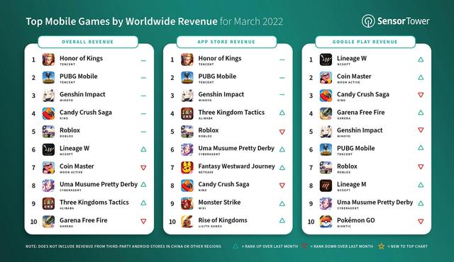 报告指出,2022 年 3 月全球收入最高的移动游戏为腾讯《王者荣耀》,吸金约 2.724 亿美元(约 17.35 亿元人民币),较 2021 年 3 月增长 5.8%,其中约 96.6% 的收入来自中国 iOS 市场。