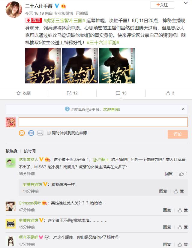 虽然最后一位神秘主播的身份现在还是众说纷纭,莫衷一是,粉丝们还在评论区各种脑洞大开,但不管最后一位主播是谁,相信她都能和JY、骚男一起在《三十六计》手游中为我们带来一场精彩的谋略大战,8月11日晚8点虎牙直播三十六计谋略大战,大家千万不要错过哟~
