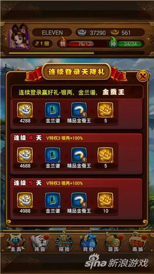 我们已进入就会弹出签到系统,我们从签到系统中可以获取大量的银两、金兰谱和精品金蚕王还有少量的元宝,在游戏当中金兰谱可以来抽取卡牌,金蚕王可以获取大量的经验,而且每周签到奖励会发生变化哦,小伙伴们可以关注一下。
