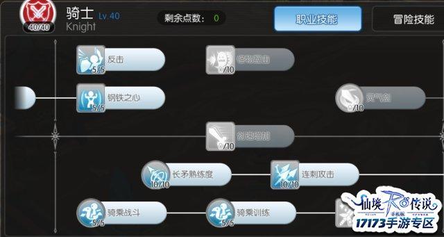骑士领主阶段的集中攻击最少2点,可以全程保持。领主光环看个人需求,越高越好。挂机3技能是连刺,集中攻击,领主光环。耐力转攻击技能效果极佳,一点可以带来15-20的攻击力,远超骑士枪专精,也建议点满。狂怒之枪是加着玩的,挂机没有卵用,追求伤害可以无视。进阶二转对枪骑的意义就是更强的攻击力,螺旋是很屎,但是后期加满集中攻击和领主光环可以极大提升连刺伤害。
