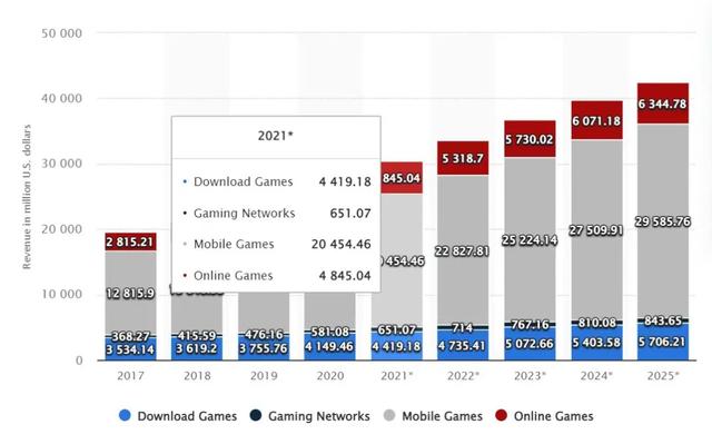 根据Statista同期数据显示,美国移动游戏人均消费为为137美元(约合人民币867元),算了一下,差不多是中国移动游戏用户的2倍以上。
