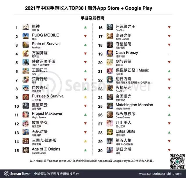 而随着中国移动游戏制作水准的提升,如《PUBG Mobile》、《荒野行动》位列美国等国家的免费游戏收入榜头部。