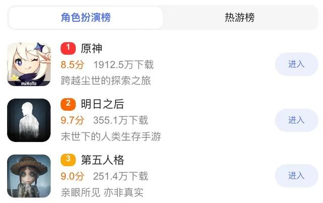 角色扮演类(ARPG/MMORPG)手游稳稳拿下头牌。