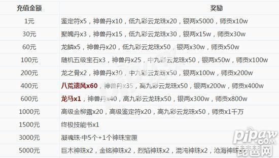 充值礼包只要到商城点击指定的仙玉进行充值,对应的充值礼包就会直接发给玩家的。充值奖励如下表: