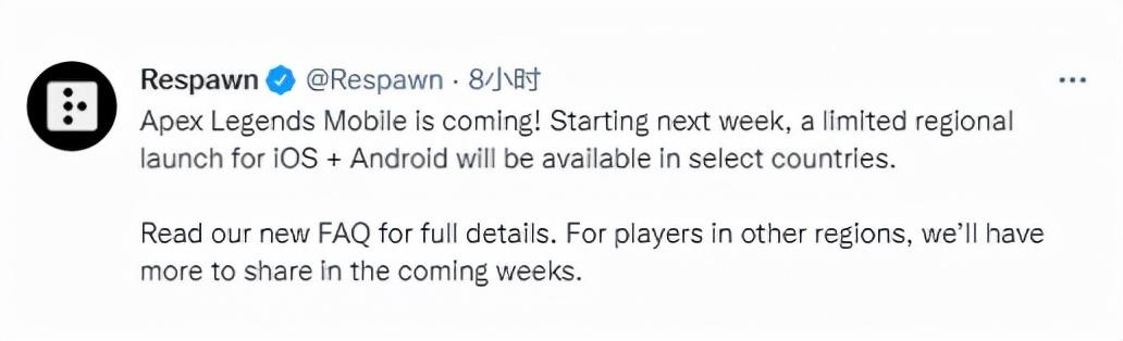 在北京时间24号凌晨,Respawn工作室在推特上宣布 ,下周一(2月28号)起《apex英雄手游》将在部分地区开始上线,ios与安卓双端将一同开启。