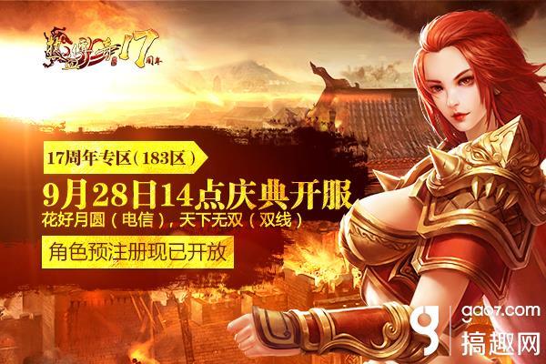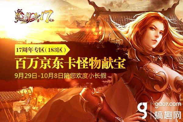 《热血传奇》17周年专区(183区)明日14点庆典开服!百万京东卡怪物献宝人人可抢!新区冲级抢顶级藏品“红木屠龙刀”!还有17周年线上晚会彻夜狂欢!17年传奇,兄弟们都在,9月28日相约玛法不见不散!