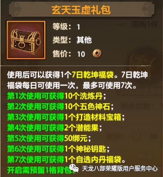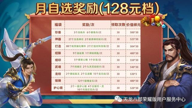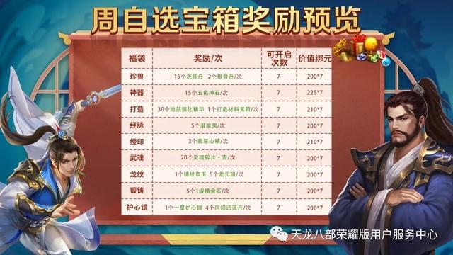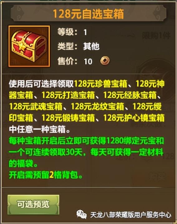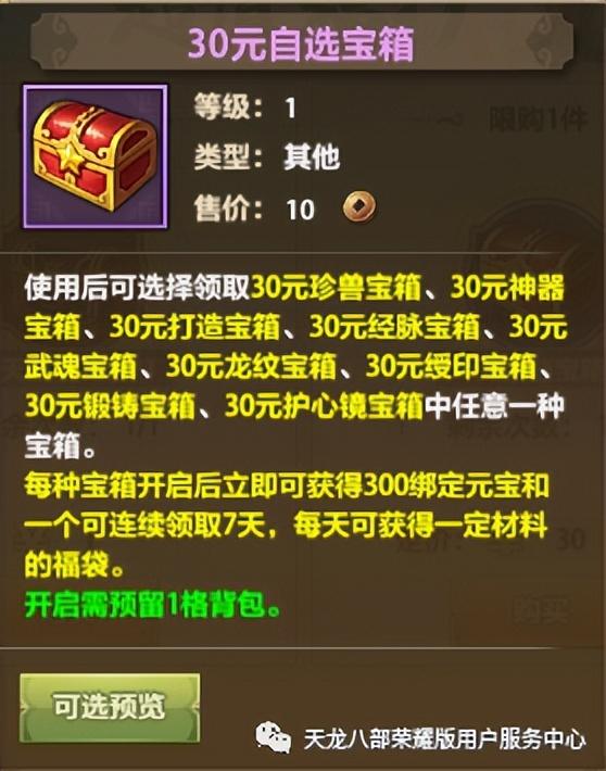 自选宝箱购入后立即返还等额的绑元,宝箱还可选择开启珍兽、神器、打造、经脉、武魂、龙纹、绶印、锻铸、护心镜九种材料的福袋中任意一种。