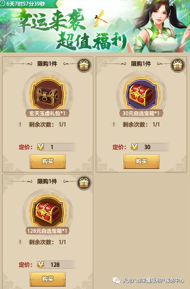 活动期间,少侠可以在金秋商城购买三种礼包:1元玄天玉虚礼包、30元自选周礼包,128元自选月礼包。