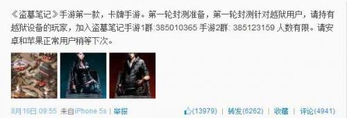 日前《盗墓笔记》作者南派三叔在微博发布消息称,首款《盗墓笔记》手机游戏第一轮封测准备开始,目前只对越狱用户。对于广大的“盗墓”迷来说可算是又有了新的盼头。