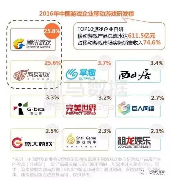 据2016年中国游戏企业移动游戏研发榜报告显示,2016年全年移动游戏收入市场到达了800亿,其中腾讯+网易的自研手游总流水占手游市场销售总量的51%,Top10游戏企业自研移动游戏产品总流水达到了611.5亿元,占据了总量的74%。