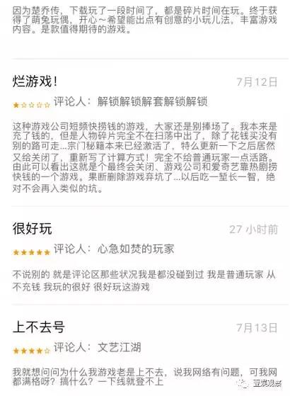 通过App Store上的评价,我们发现玩家多对《楚乔传》“游戏玩法”“付费严重”“网络掉线”等问题打了一星差评,而好评多是因为“剧情贴合”而来的电视剧观众。