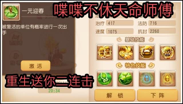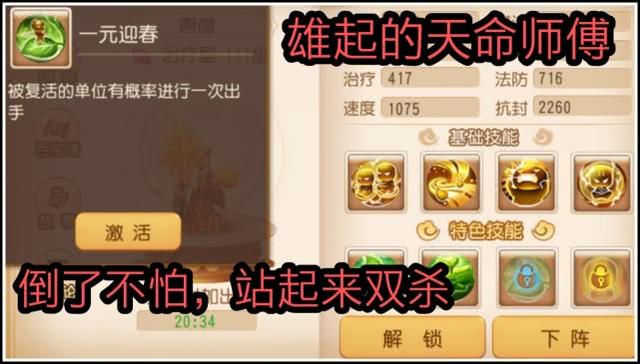 [一元迎春]在拯救队友后还可能附加赠送他一次出手机会。[金蟾自身]这个技能真的是名副其实,在我佛慈悲状态死亡时概率免疫死亡,真的是辅助需要的技能他都有,还都很厉害!