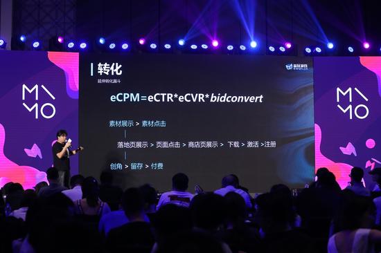 曝光,即与市场博弈。他认为,曝光是第一位也是最重要的一位,每个大的广告平台都有上万条广告等待下发,只有ECPM最高的才能把曝光拿下来,因而曝光意味着跟整个市场、合作伙伴、友商进行博弈,同时,意味着要充分认识平台的能力和算法,即 Y=F(Xa,Xu,Xc),Y就是最终的广告展现结果,a、u、c代表了广告、用户和环境,把广告特征和后续的用户特征、环境特征进行拟合,才能达到更好的曝光效果。