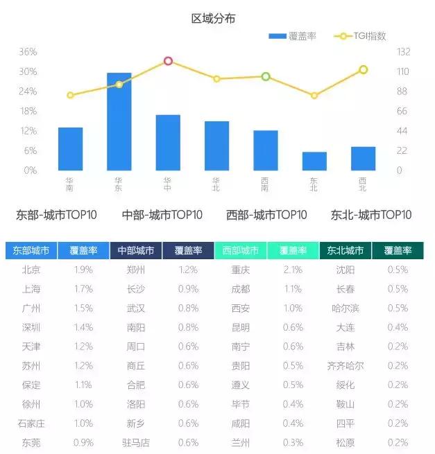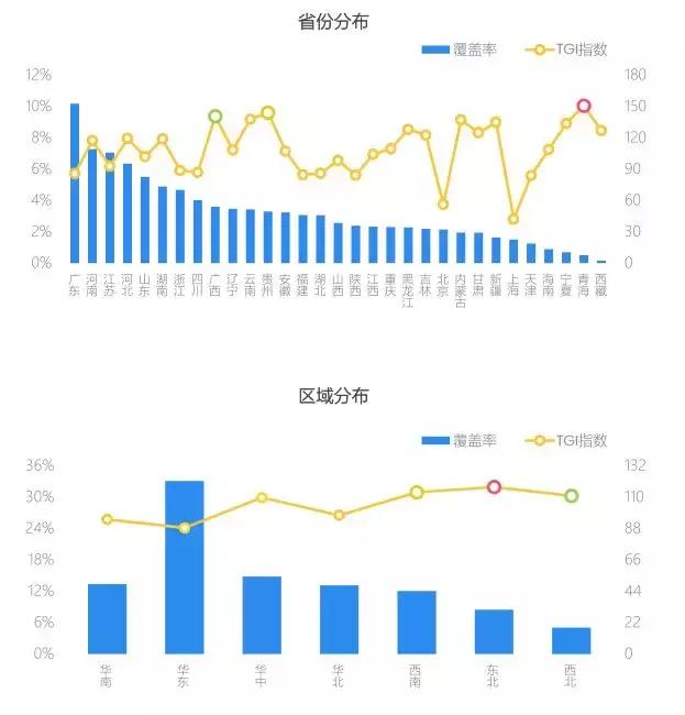 热血汉子相对集中于广东、河南、江苏、河北和山东等人口大省,其中广东以超过10%的占比居全国首位,相比整体移动互联网人群,热血汉子在青海、贵州和广西的TGI指数较高;热血汉子在华东的比重尽管高但TGI指数低,东北的TGI指数最高。