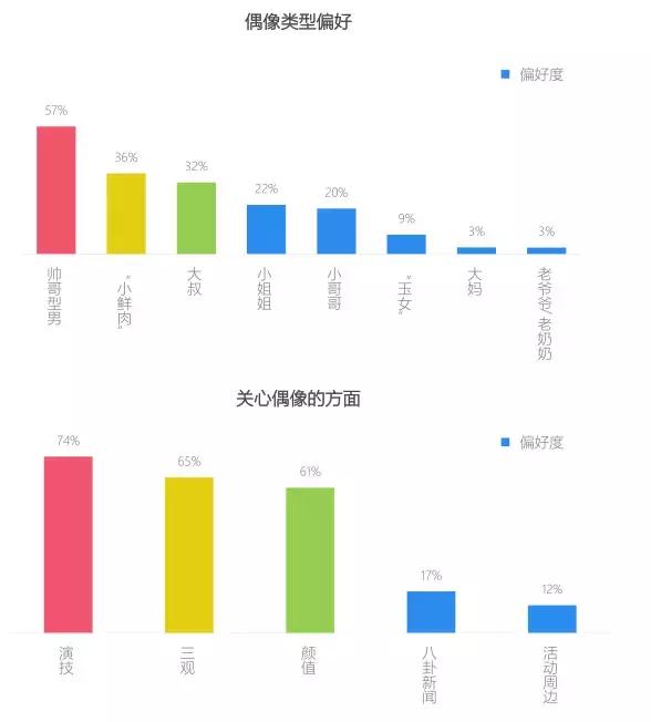在偶像类型偏好方面,57%的游戏佳人更加喜欢帅哥型男,36%的人喜欢“小鲜肉”,32%的人喜欢大叔;在关心偶像标准方面,74%的游戏佳人比较在意演技,“戏骨、戏精、实力派”更受她们关系,65%的人在乎三观,61%的人则更看中颜值。