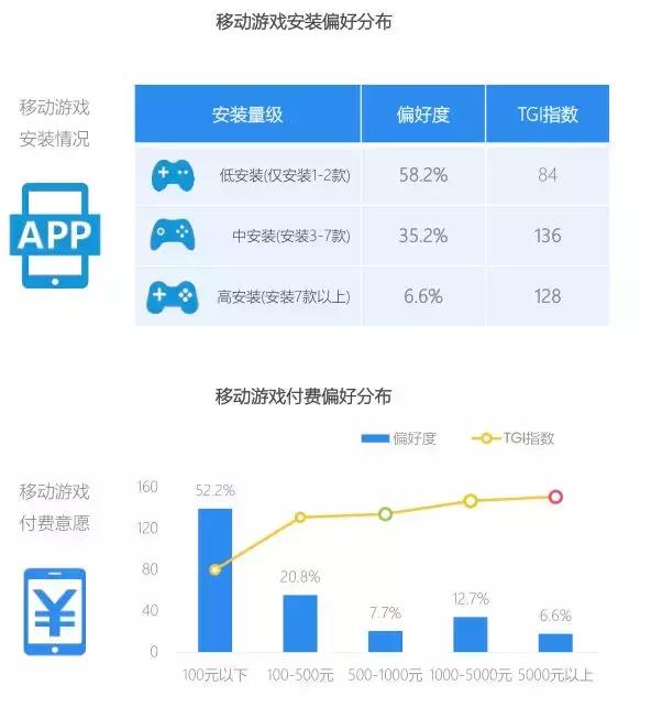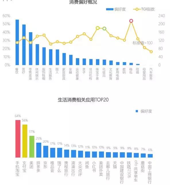 游戏佳人整体比较偏好餐饮、医疗、零售卖场等消费,注重吃穿以及健康,相比移动互联网人群,游戏佳人在箱包的TGI指数超过200,说明她们对箱包情有独钟;在生活消费的移动应用上,她们偏好手机淘宝、支付宝、美团、拼多多和京东等App。