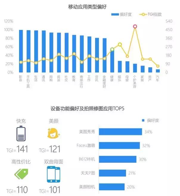 游戏佳人都有一颗美丽的心,相比移动互联网人群,她们在个护美容的TGI指数高达487,说明她们力求通过个护美容塑造起美好形象;为了时刻保持靓丽的美肌状态,游戏佳人比较偏重美颜功能设备,以及美图秀秀、Faceu激萌等拍照修图App。