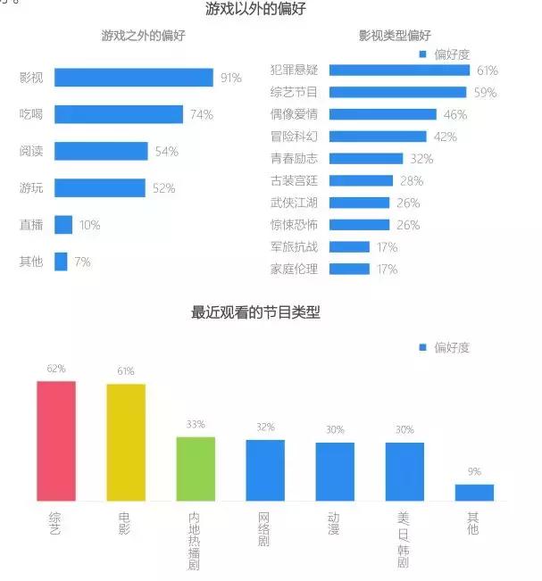 游戏佳人的休闲娱乐方式并不仅在于移动游戏,91%的她们还倾向观看影视,相对喜欢犯罪悬疑、综艺节目、偶像爱情、冒险科幻和青春励志等类型影视作品,最近观看较多的节目是综艺和电影;此外,她们对吃喝、阅读和游玩也有着较高的偏好。