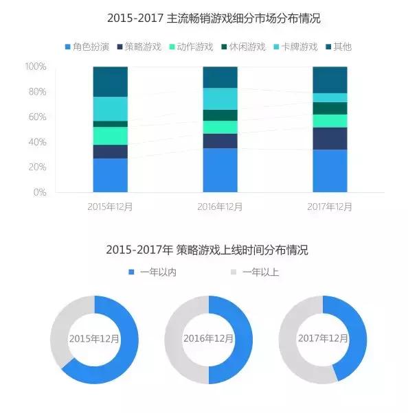 角色扮演游戏目前仍旧是主流畅销游戏,为整个移动游戏市场创造了较多的收益,与此同时,策略游戏比重开始逐渐提升,而且,一年以上运营时间的策略游戏占比不断增加,策略游戏成为重要市场。