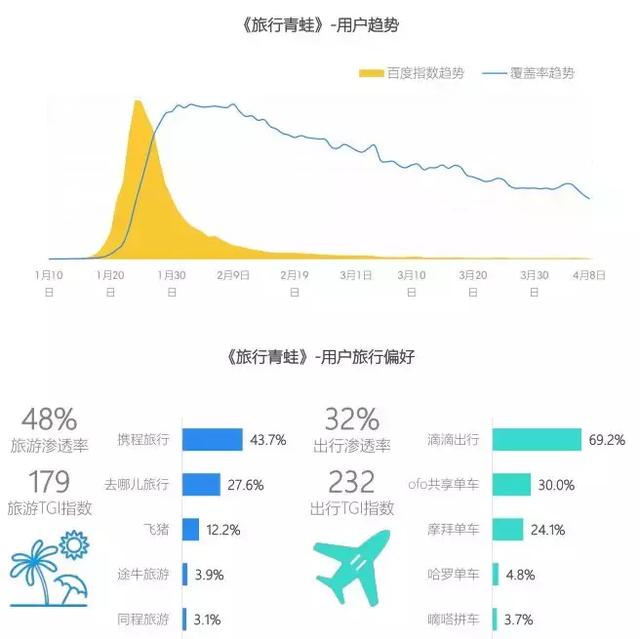 2018年初,《旅行青蛙》风靡中国,被玩家视为“儿子”的小青蛙开始引爆朋友圈,从其百度指数和覆盖率变化趋势看,玩家养蛙的热度并没有长久维持下去,相比让“呱儿子”外出旅行,人们更在意本身的旅行,超过1/3的用户都会安装旅行应用。