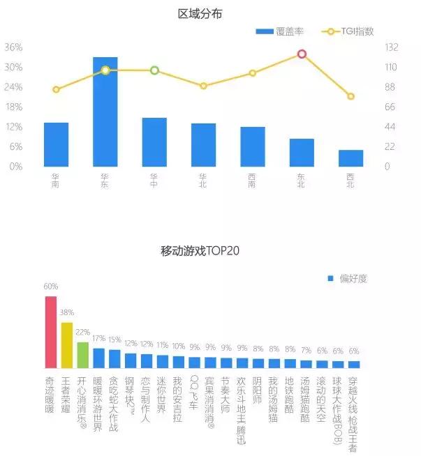 1/3的游戏佳人分布在华东地区,说明华东地区不仅盛产美女,也是女性玩家集聚地,相比移动互联网人群,游戏佳人在东北地区的TGI指数超过120,说明东北女人也比较偏好移动游戏;游戏佳人不仅青睐奇迹暖暖的甜美,也喜欢王者荣耀的英姿。