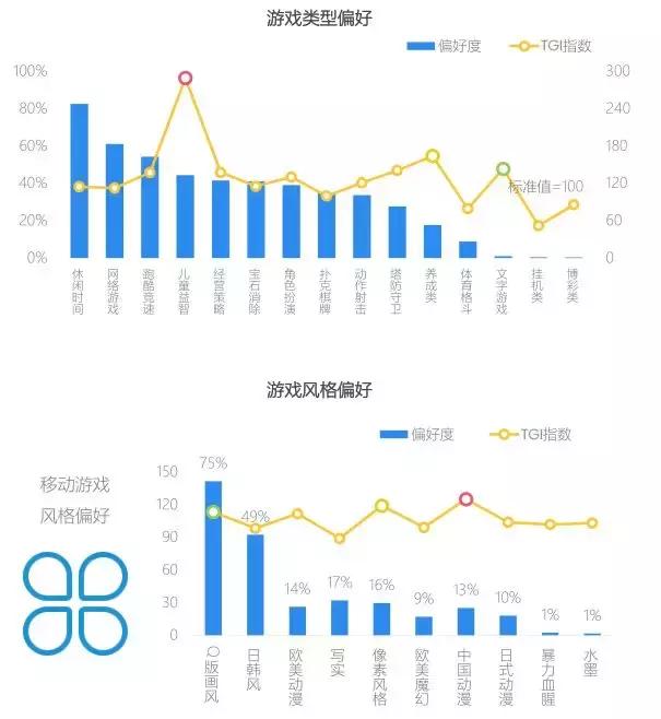 寓教于乐人群享有充分的游戏和娱乐机会,他们通过游戏的方式促进孩童智力的发展,儿童益智游戏的TGI指数达到289,说明游戏发挥着教育作用;在游戏风格上,寓教于乐人群相对偏好中国动漫、像素风格和Q版画风,可爱风格更能俘获童心。