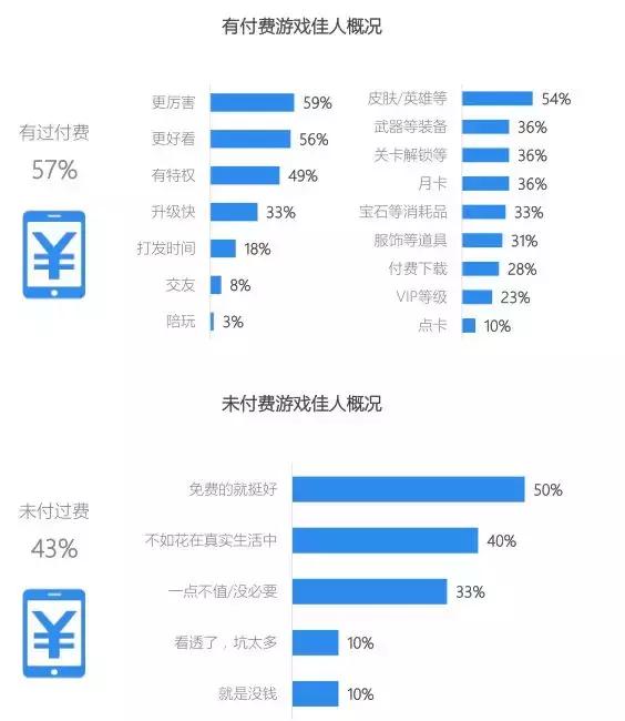 57%的游戏佳人曾为移动游戏买单,她们愿意将金钱花费在更厉害、更好看、以及皮肤/英雄等,比较重视游戏内的实力和装扮;43%的游戏佳人还未向移动游戏付费,有一半人以为免费的就挺好,40%的人则认为不如花在真实生活中。