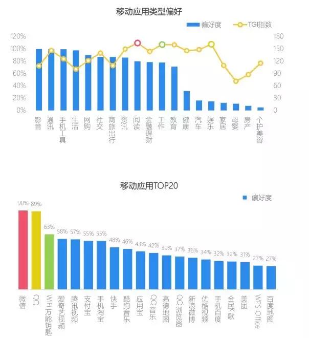 热血汉子不仅仅偏爱游戏,日常生活中同样离不开影音、通讯、工具、生活等App,相对整体互联网人群更加偏好阅读、工作和娱乐类应用;除了微信、QQ等维系社交的应用外,热血汉子还喜欢通过爱奇艺视频和腾讯视频满足追影需求。