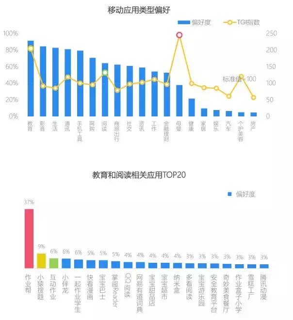 寓教于乐是一个长期的过程,家长的陪伴和文教的熏陶,使得子女在成长的道路上不断提升知识文化水平。移动应用作为互动性较好的媒介,母婴、教育、阅读等类型移动应用受到家庭成员的偏爱,37%的寓教于乐人群相对偏好作业帮App。